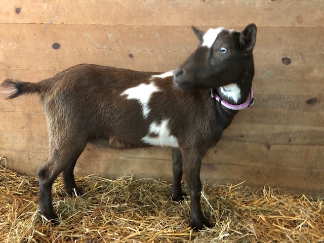 SOLD Mirabella—is a buckskin doeling with white pole, min. White on her left flank. She has blue eyes.