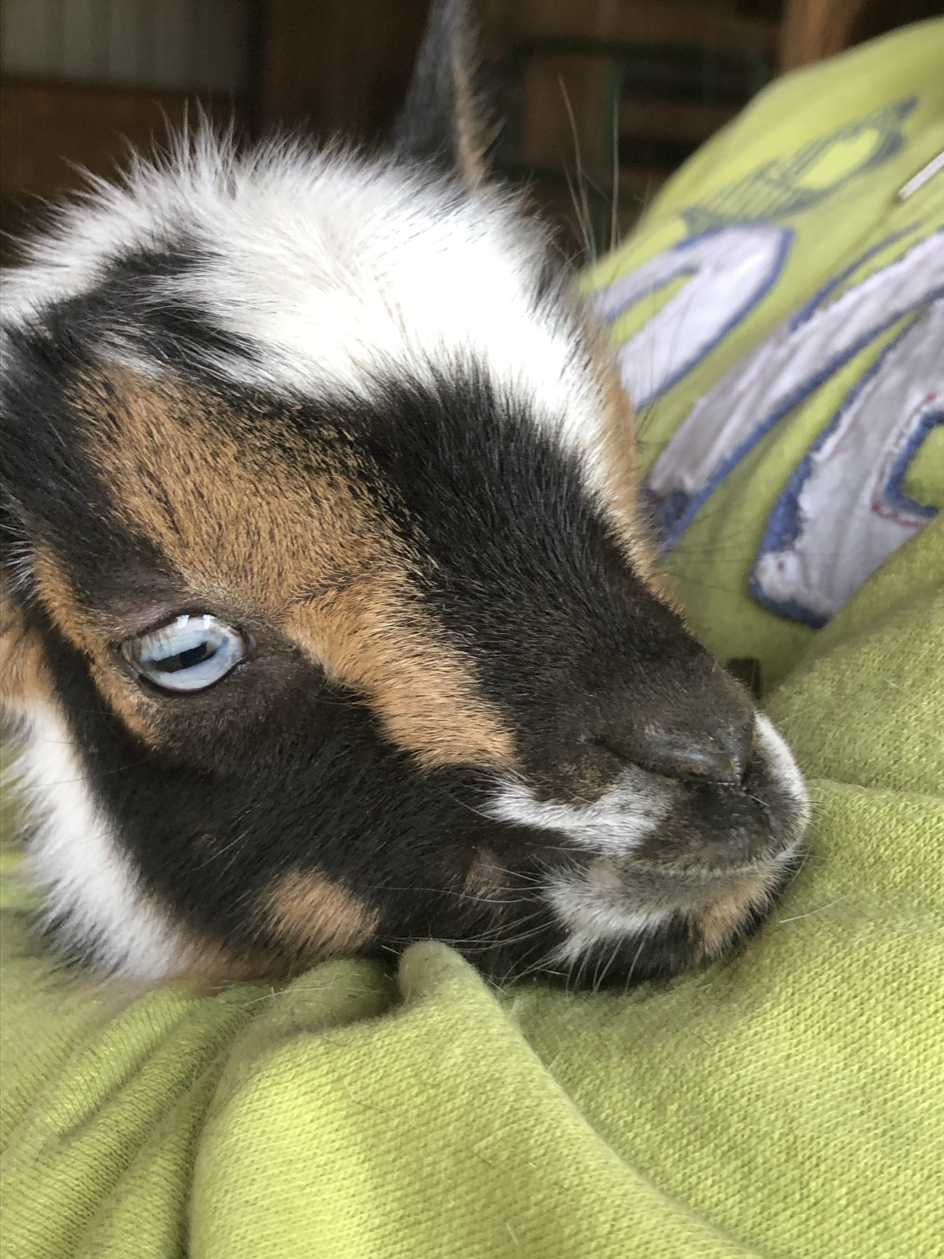 SOLD!! Iris— is buckskin doeling with white pole and blue eyes.